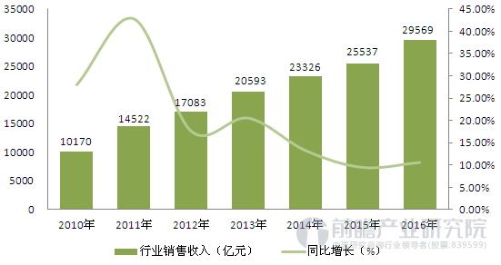 圖表2:2010-2016年中國醫藥行業(yè)銷(xiāo)售收入及增長(cháng)率走勢(單位:億元,%)
